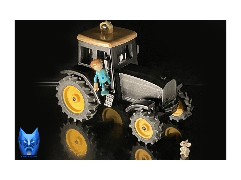 Robustní černý dřevěný traktor, který zaujme na první pohled! V jeho kabině se nachází cisterna o objemu 0,2 l a za volantem sedí pozorný traktorista, připravený vyrazit do terénu. Tento originální model spojuje precizní řemeslné zpracování s nápaditým designem, což z něj činí skvělý dárek pro každého milovníka traktorů a venkovského života. Perfektní doplněk do sbírky nebo jako netradiční dekorace!
