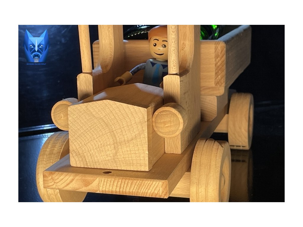Poctivý přírodní dřevěný náklaďák, který veze vzácný poklad - lahvičku Becherovky 38% o objemu 0,5 l na korbě ! Za volantem sedí usměvavý řidič, připravený doručit dobrou náladu. Tento originální kousek je skvělým dárkem pro milovníky silnic i všechny, kteří ocení vtipný a zároveň stylový doplněk. Perfektní kombinace řemeslné práce a zábavy !
