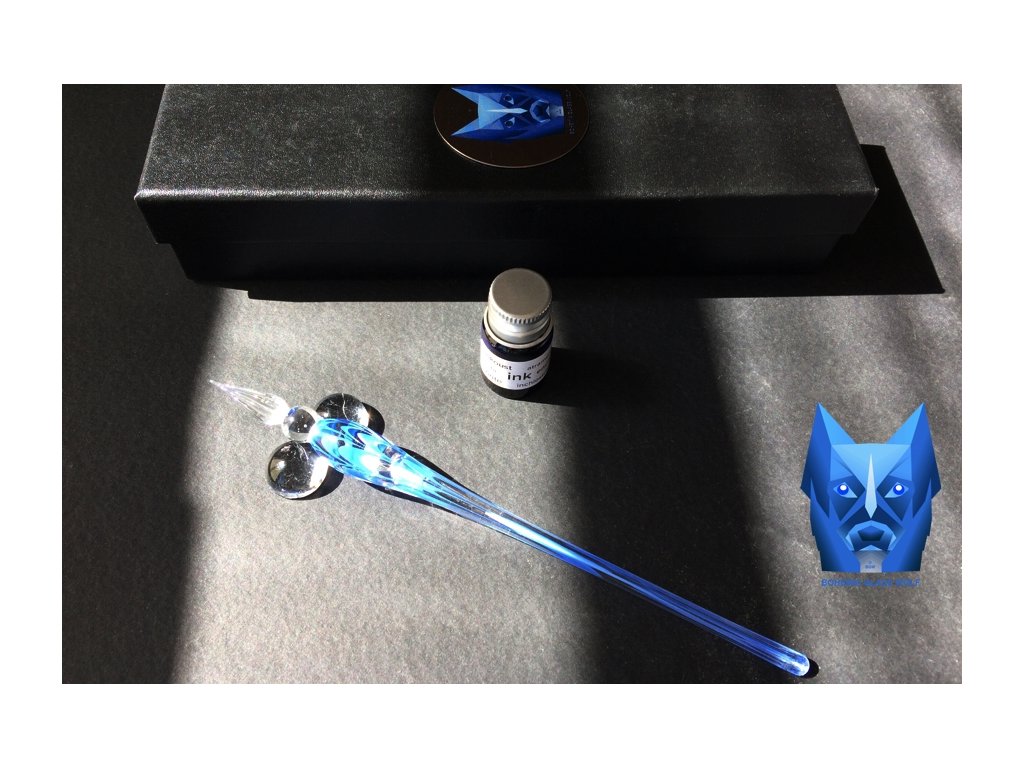 Sada obsahuje skleněné pero, stylovou podložku a lahvičku modrého inkoustu. Vše je pečlivě uloženo v elegantní dárkové krabičce, která z něj činí ideální dárek pro milovníky krásného psaní, umění nebo české sklářské tradice.