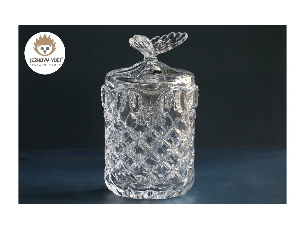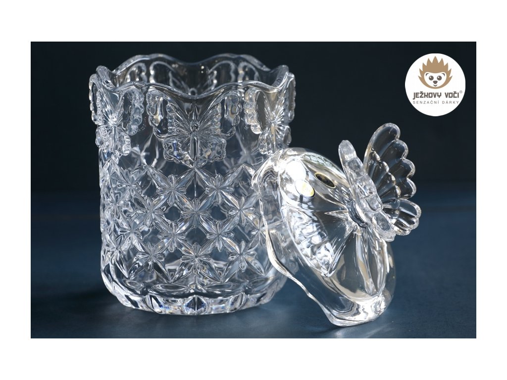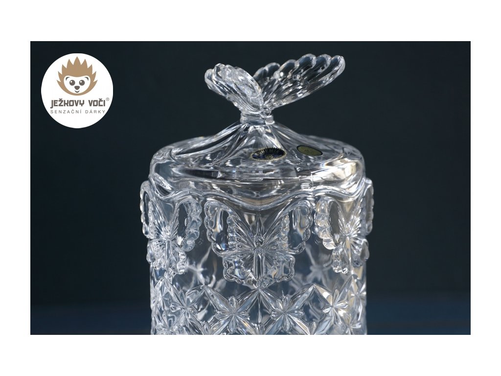DÓZA Z OLOVNATÉHO KŘIŠŤÁLU CRYSTAL BOHEMIA - MOTÝLE vyrobená z olovnatého křišťálu je proto nejen esteticky působivá, ale i exkluzivní dekorací, která pod světlem vynikne svou krásou a elegancí.