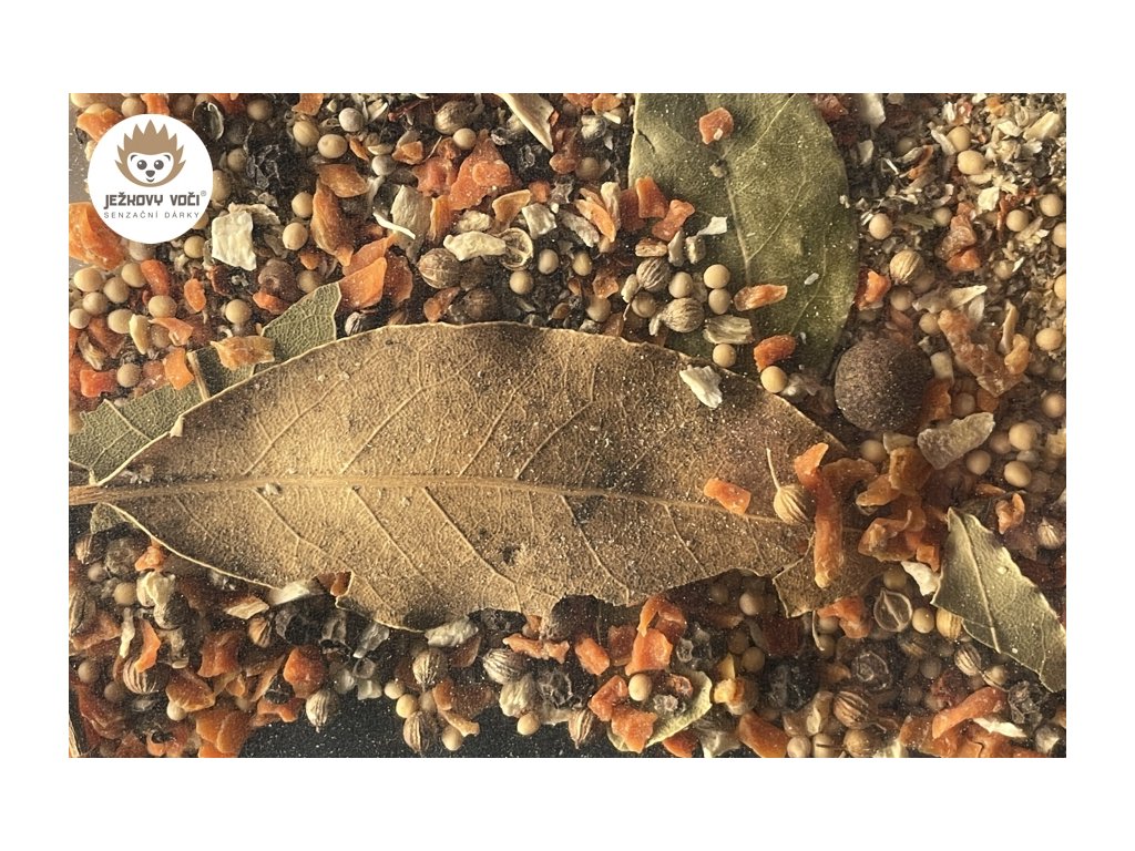 Složení: hořčice bílá celá, karotka sušená granulovaná, cibule sušená granulovaná, pepř černý celý, nové koření drcené, pastiňák sušený granulovaný, koriandr, bobkový list.