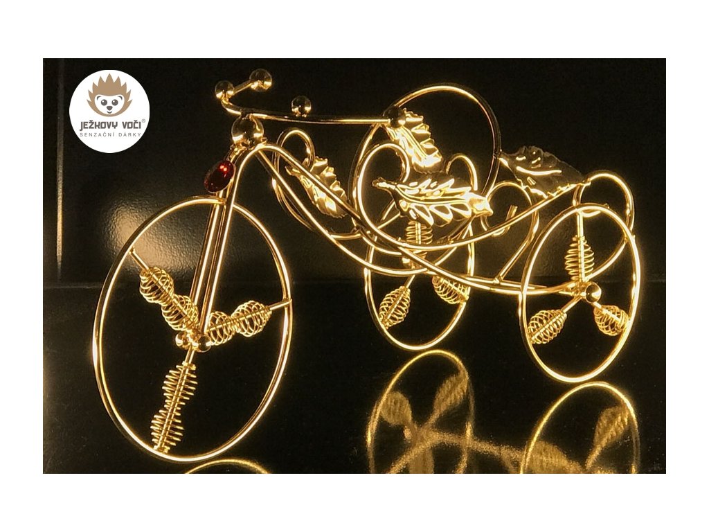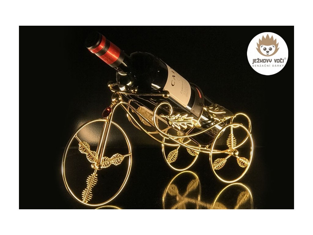 Výjimečný design, který spojuje eleganci, nostalgii a špetku extravagance. Tento kovový stojan na víno v bohatém zlatém provedení představuje stylovou tříkolku, jejíž dominantou je skleněný krystal evokující světlo - jako maják pozornosti, který upoutá v každém interiéru.