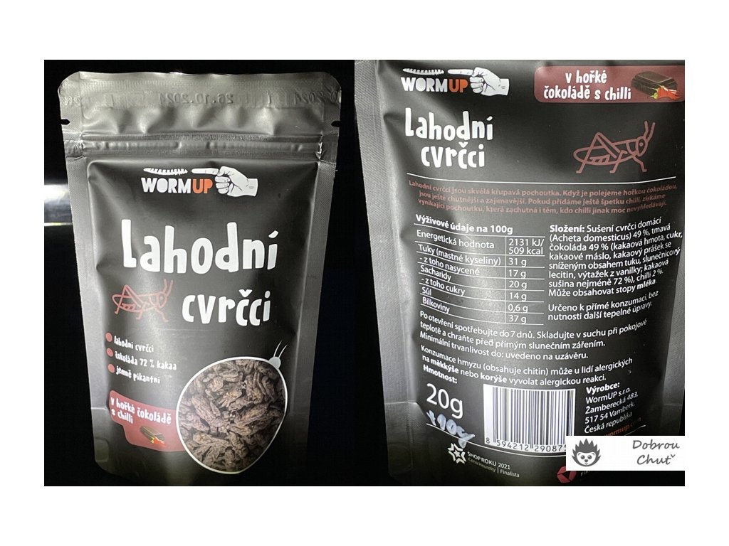Představujeme vám lahodnou delikatesu - LAHODNÍ CVRČCI V HOŘKÉ ČOKOLÁDĚ S CHILLI. Spojení lahodních cvrčků. hořké čokolády a chilli vytváří jedinečný chuťový zážitek, který potěší vaše smysly. Tento nevšední snack je nejen chutný, ale i zdravý. Cvrčci jsou bohatí na bílkoviny, vitamíny a minerály. Překvapte své přátele netradiční pochoutkou, která zaručeně zaujme a okouzlí. Ideální jako originální dárek nebo gurmánská pochoutka na večírky. Vyzkoušejte něco nového a nechte se unést exkluzivní kombinací chutí!