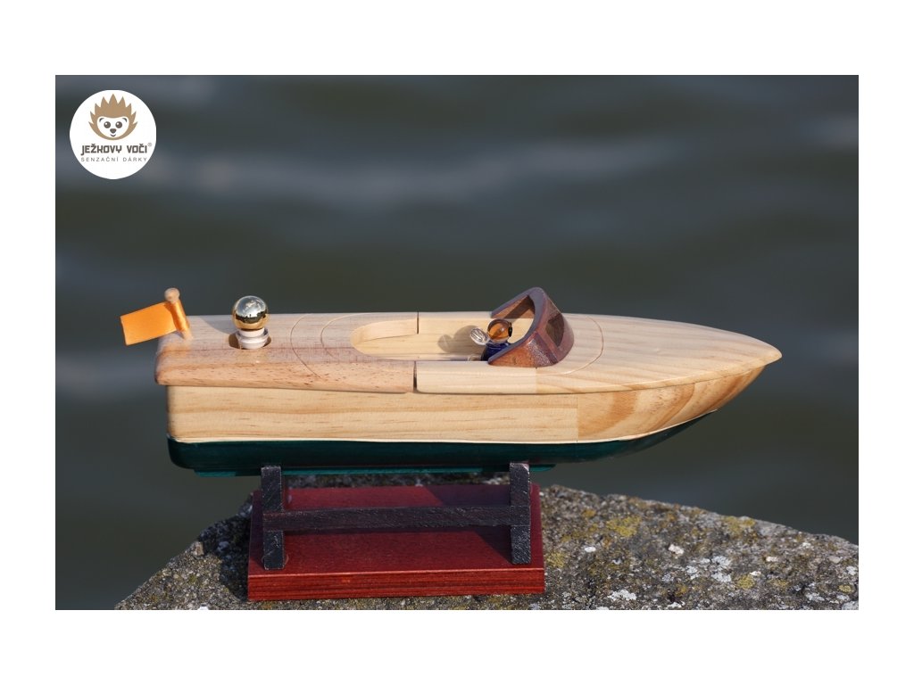 Elegantní dřevěný člun, který v sobě ukrývá skleněnou láhev o objemu 0,2 l, která je naplněna 40% švestkovým destilátem je jedinečnou kombinací stylu a kreativity. Precizní řemeslné zpracování člunu vyniká detailními liniemi, které dodávají dekoraci námořní šarm. Láhev je umístěna v trupu člunu, perfektně zapadá do jeho designu a přináší prvek originality. Tento nevšední kousek je upevněn na pevném dřevěném stojánku, který podtrhuje jeho eleganci. Ideální jako dárek, dekorace nebo originální připomínka lásky k moři, která si najde své místo v každém interiéru.