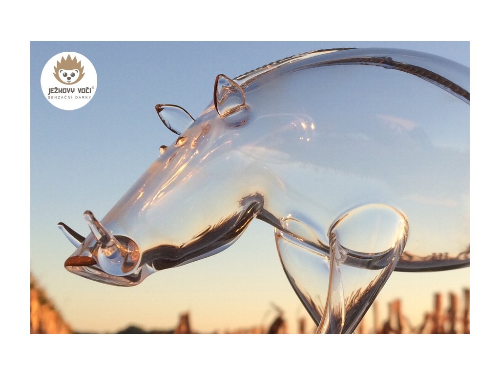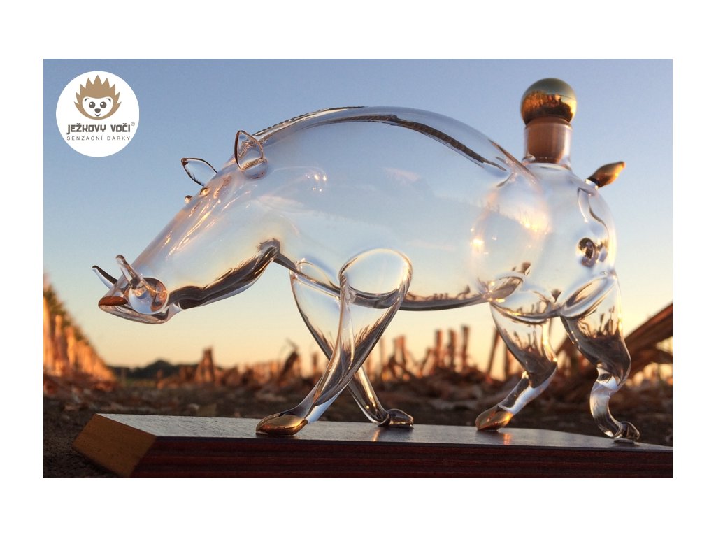 Skleněná láhev o objemu 0,2 l ve tvaru divočáka zachyceného v pohybu je mistrovským kouskem našich sklářů. Divočák je umístěn na elegantním dřevěném stojánku. Detaily divočáka, včetně hlavy, nohou a ocasu, jsou pozlacené, což dodává luxusní vzhled. Precizní řemeslné zpracování zvýrazňuje texturu srsti a dynamiku pohybu.