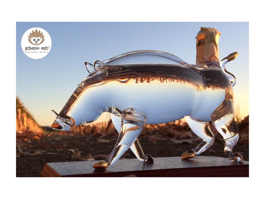 Skleněná láhev o objemu 0,2 l, která je naplněna 40% švestkovým destilátem, ve tvaru divočáka zachyceného v pohybu je mistrovským kouskem českých sklářů. Divočák je umístěn na elegantním dřevěném stojánku. Detaily divočáka, včetně hlavy, nohou a ocasu, jsou pozlacené, což dodává luxusní vzhled. Precizní řemeslné zpracování zvýrazňuje texturu srsti a dynamiku pohybu.
