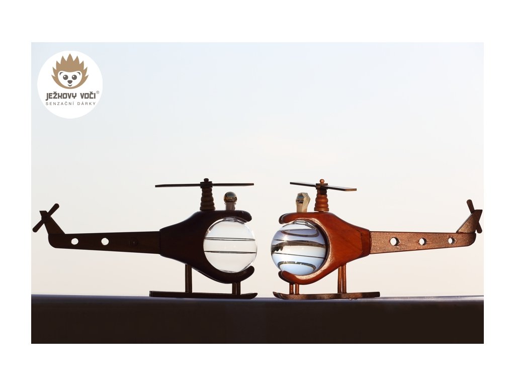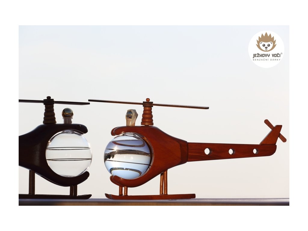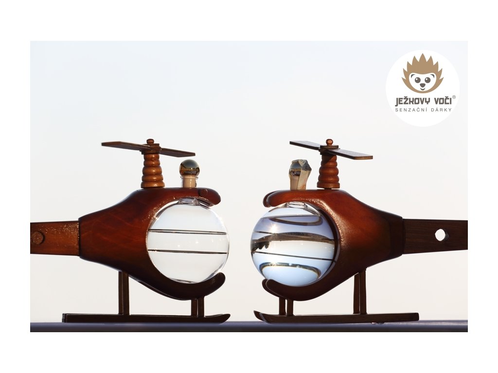 Dřevěná helikoptéra se skleněnou cisternou o objemu 0,2 l, naplněná 40 % švestkovým destilátem je stylovým dárkem, který potěší milovníky letectví, dobrodružství a originálních dekorací. Tento model spojuje řemeslnou zručnost s praktickým využitím.