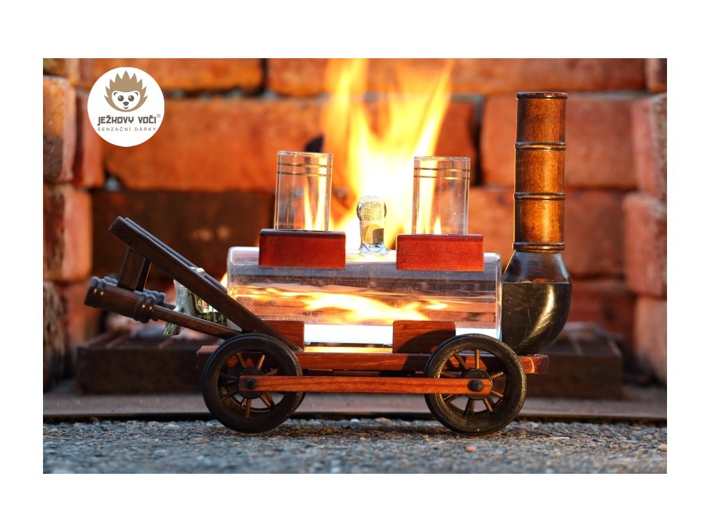 Dřevěný hasičský vozík se skleněnou cisternou o objemu 0.2 l, která je naplněna 40% švestkovým destilátem je originálním a stylovým dárkem, který potěší nejen hasiče, ale i milovníky tradičních řemesel či sběratele unikátních předmětů.