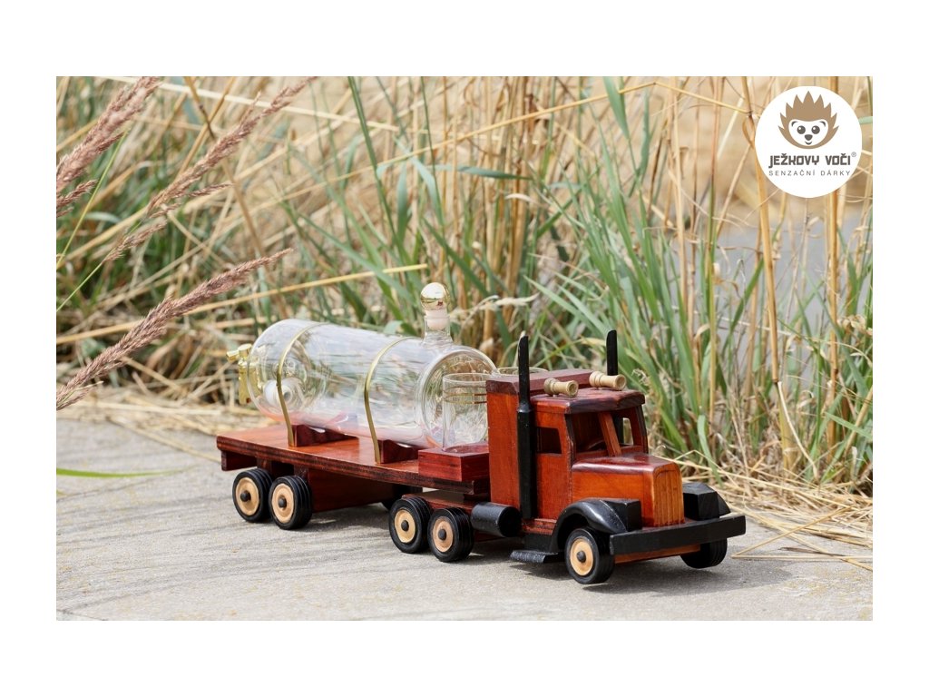 Jestli vás lákají dálky, tak nasedněte, zapněte si pásy a připravte se na divokou jízdu s tímto tahačem ! Dřevěný kamion se skleněnou cisternou 0,5 l a kohoutkem na čepování oblíbených nápojů je originálním a praktickým dárkem, který potěší profesionální řidiče kamionů.