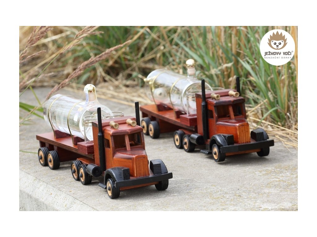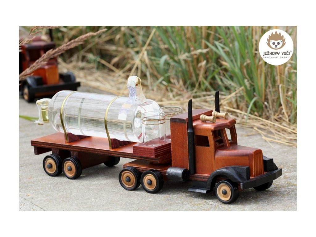 Jestli vás lákají dálky, tak nasedněte, zapněte si pásy a připravte se na divokou jízdu s tímto tahačem ! Dřevěný kamion se skleněnou cisternou o objemu 0,5 l, naplněnou 40% švestkou a kohoutkem na čepování oblíbených nápojů je originálním a praktickým dárkem, který potěší profesionální řidiče kamionů.