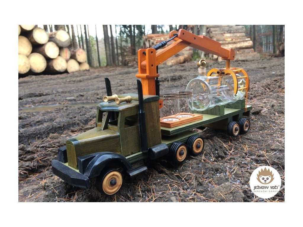 Dřevěný kamion s jeřábem, skleněnou cisternou o objemu 0,35 l a dvěma odlivkami. Tento kamion v zelenohnědé barevné kombinaci je elegantním a praktickým dárkem, který ocení zejména dřevaři a milovníci trucků.