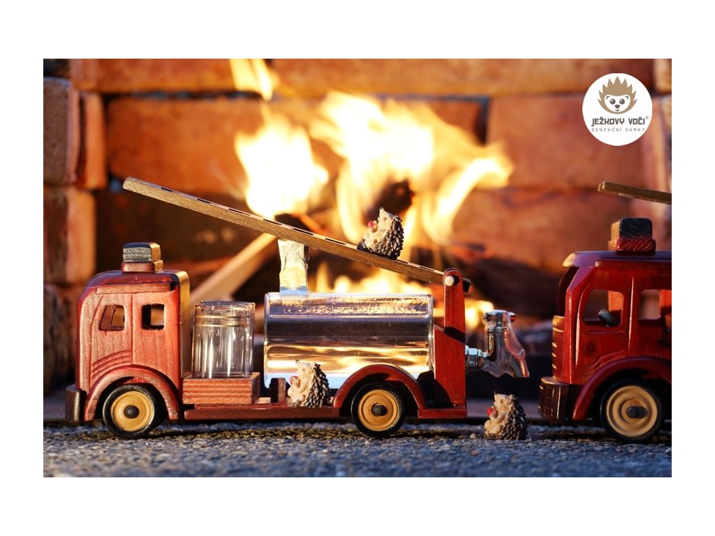 Dřevěné hasičské auto v červeno-vínové barvě, vybavené žebříkem a skleněnou cisternou o objemu 0,2 l, s kohoutkem na čepování a dvěma odlivkami představuje ideální dárek pro hasiče a hasičské sbory.