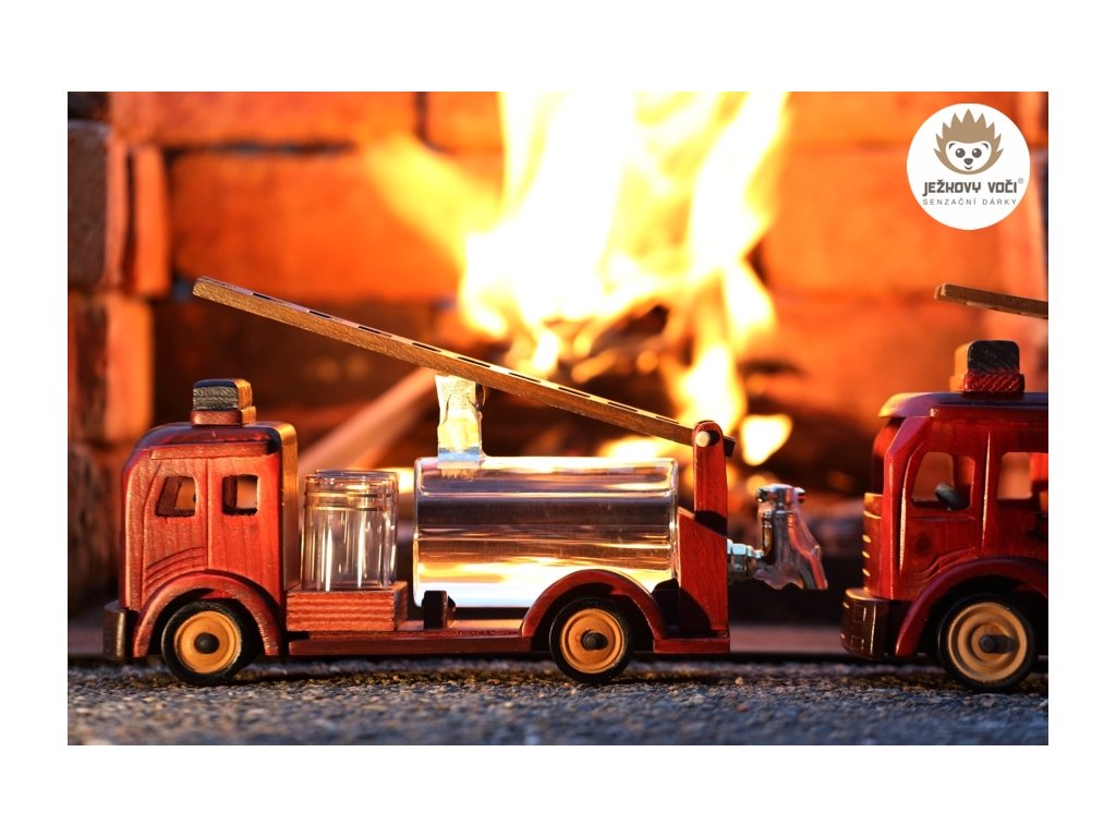 Dřevěné hasičské auto v červeno-vínové barvě, vybavené žebříkem a skleněnou cisternou o objemu 0,2 l, která je naplněná 40% švestkou, s kohoutkem na čepování a dvěma odlivkami představuje ideální dárek pro hasiče a hasičské sbory.