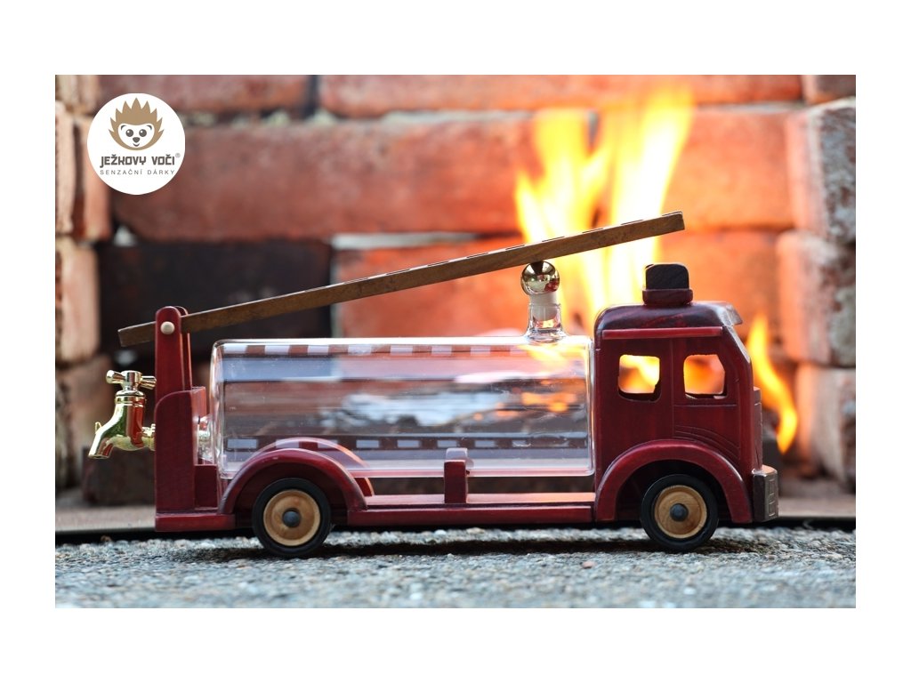 Dřevěné hasičské auto v červeno-vínové barvě, vybavené žebříkem a skleněnou cisternou o objemu 0,5 l, s kohoutkem na čepování představuje ideální dárek pro hasiče a hasičské sbory.