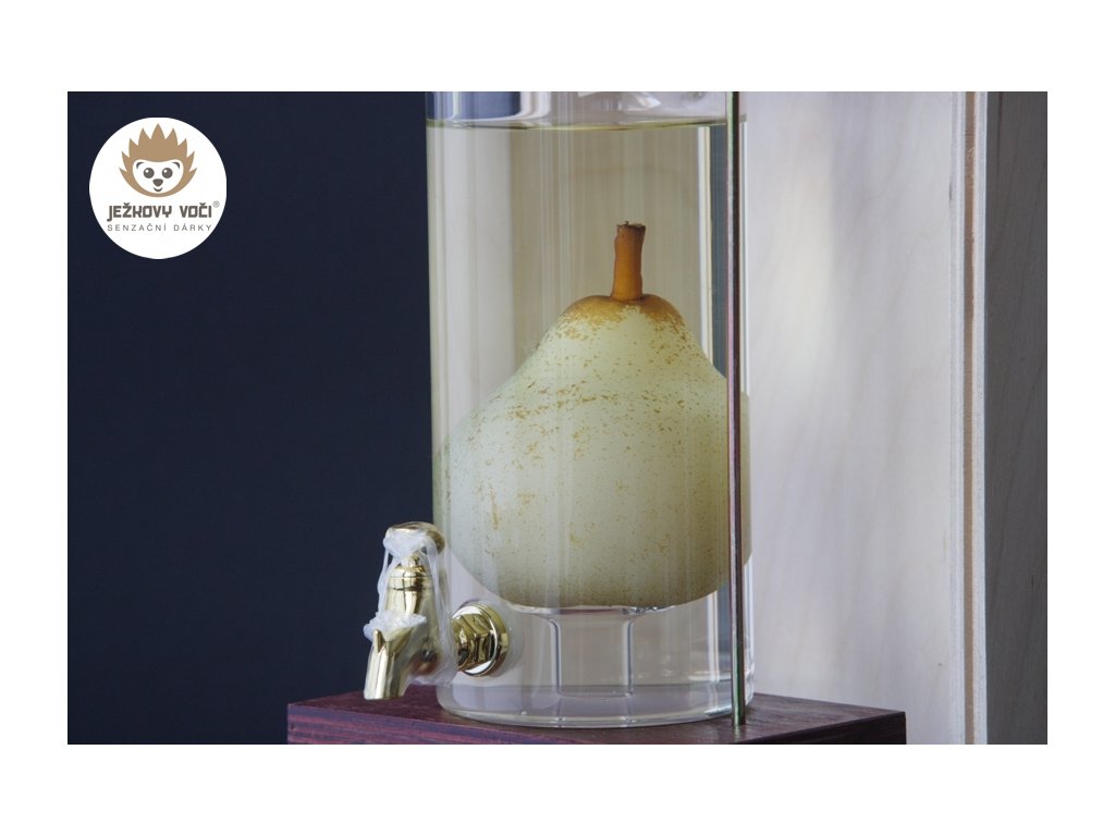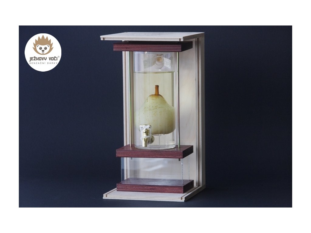 Luxusní skleněná láhev s kohoutkem pro snadné čepování ukrytá v elegantní dřevěné bedýnce nese opravdovou hrušku plující v poctivém hruškovém destilátu. Každý doušek je oslavou řemesla, přírody a jedinečného okamžiku. Spojení přírodního dřeva a zralého ovoce vytváří zážitek, na který se nezapomíná - chuť, která dozrála v lahvi.