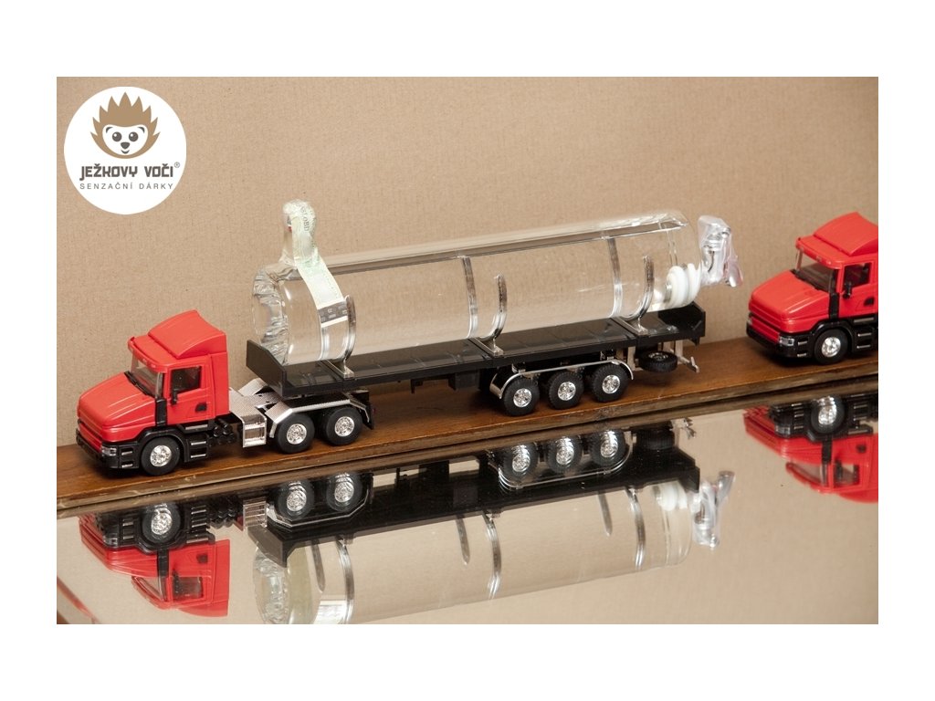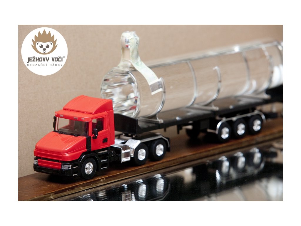 Jestli vás lákají dálky, tak nasedněte, zapněte si pásy a připravte se na divokou jízdu s tímto tahačem ! Plastový kamion červené barvy se skleněnou cisternou 0,5 l, která je naplněna 40% švestkou a kohoutkem na čepování je originálním a praktickým dárkem, který potěší profesionální řidiče kamionů.