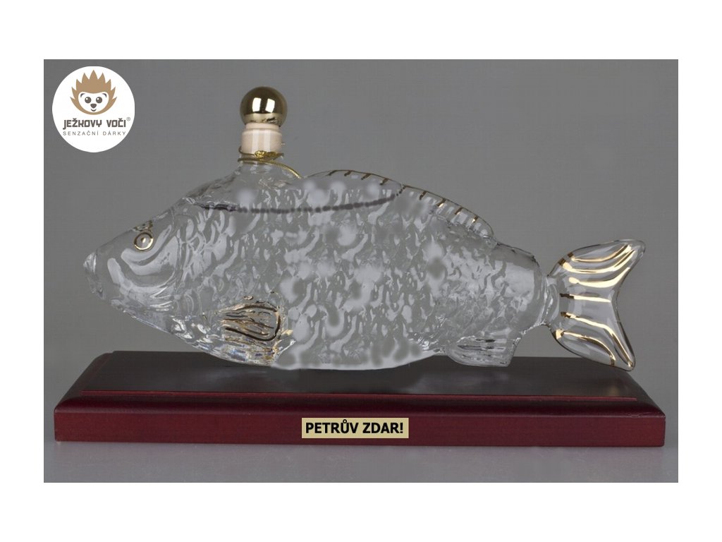 Tato elegantní skleněná láhev ve tvaru kapra o objemu 0,35 l, která je naplněna 40% švestkovým destilátem je mistrovským kouskem, který potěší každého milovníka rybaření. Pečlivě propracované detaily a jemné zlacení dodávají láhvi jedinečný vzhled, zatímco dřevěný stojánek zajišťuje stabilitu a elegantní prezentaci. Ideální jako originální dekorace, která připomene vášně spojené s časem stráveným u vody.