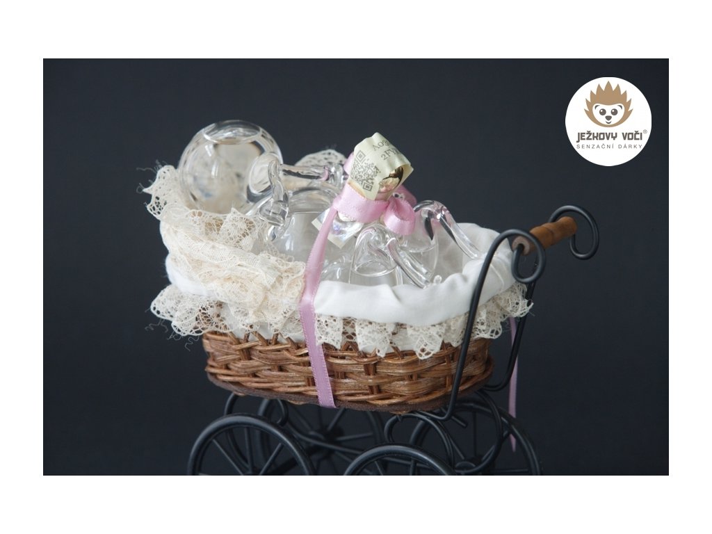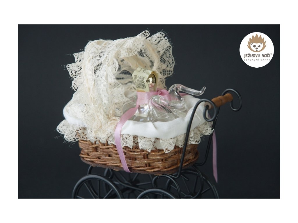 Tento nádherný kovový kočárek s pleteným košem je dokonalou poctou vintage eleganci. Jeho krajková stříška a jemná modrá stuha dodávají celku romantický a něžný nádech. Uvnitř kočárku se ukrývá skleněná lahvička ve tvaru miminka o objemu 0,1 l, která je roztomilým a originálním detailem. Precizní zpracování kočárku připomíná kouzlo dávných časů, kdy každý detail měl své místo a smysl. Tento jedinečný kousek je ideální jako stylový dárek nebo ozdoba, která vnese do vašeho domova nádech nostalgie a něhy.