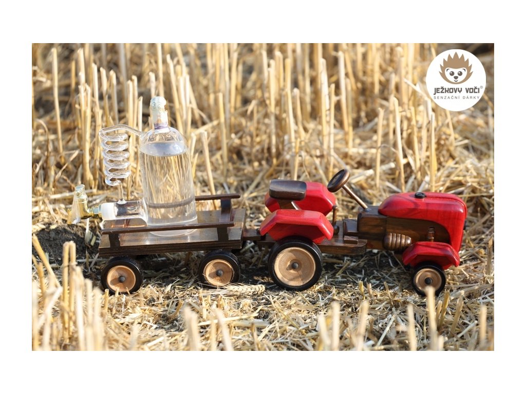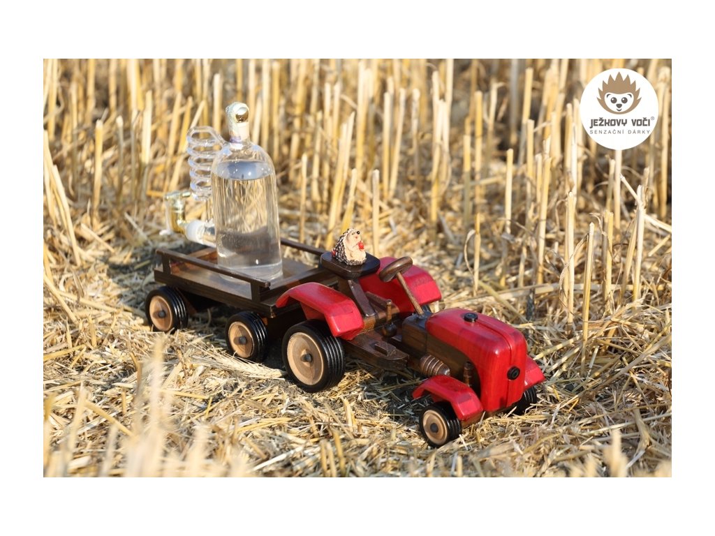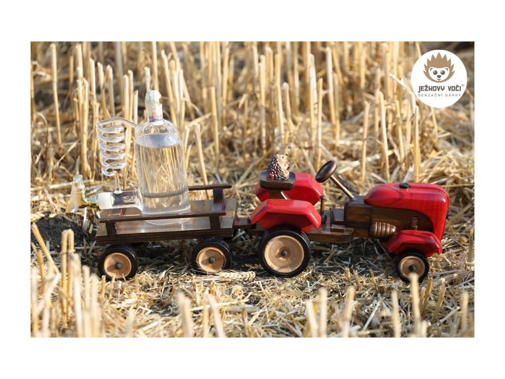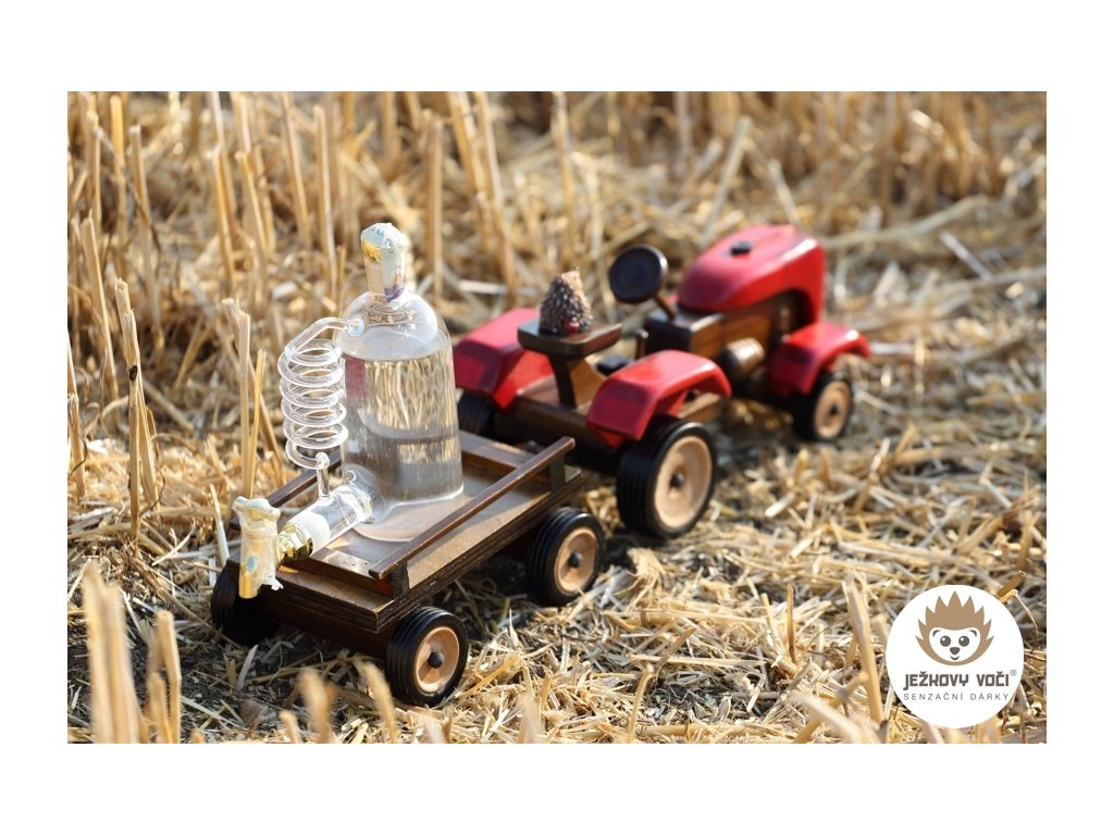 Dřevěný traktor s destilačním přístrojem o objemu 0,2 l, který je naplněný 40% švestkou je originálním a stylovým dárkem, který potěší nejen traktoristy, ale i pracovníky v zemědělství či milovníky netradičních dekorací.