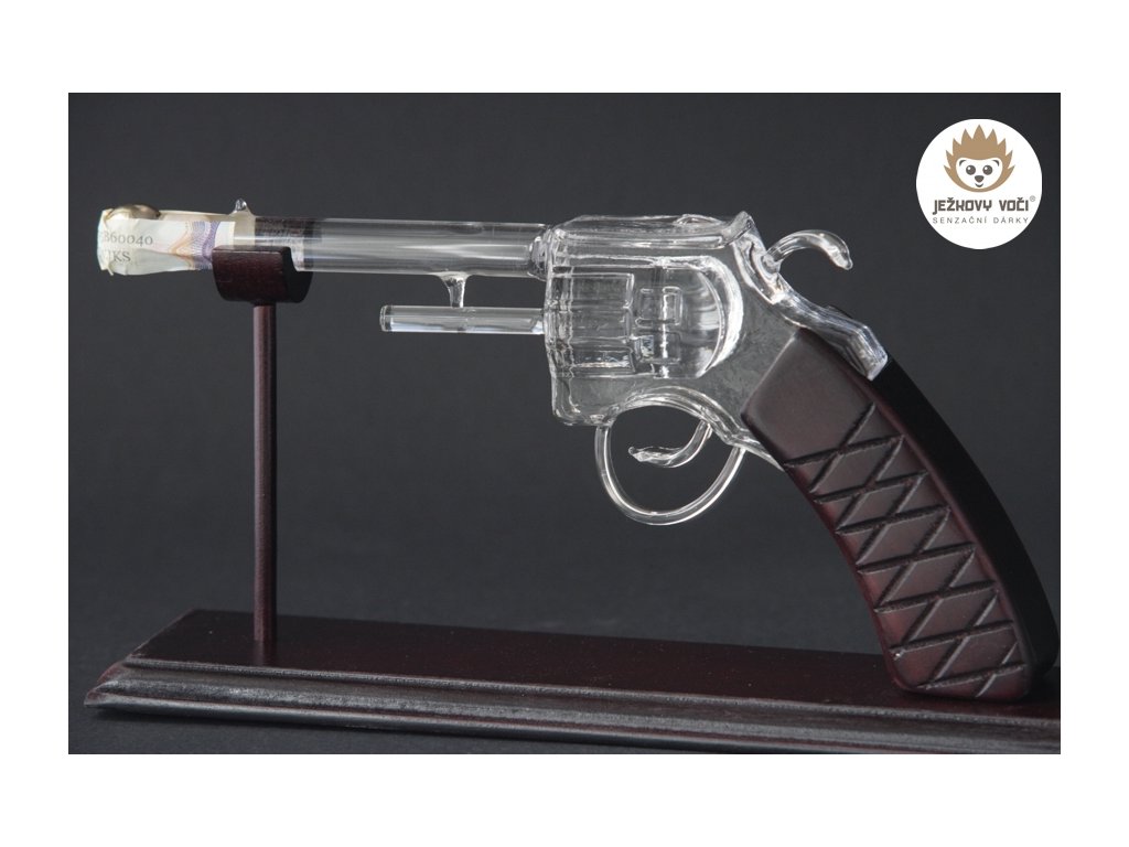 Tato láhev není pro slabochy! Masivní skleněná pistole s precizně vyřezanou dřevěnou rukojetí o objemu 0,1 l je symbolem síly, odhodlání a stylu. Každý detail včetně skleněné spouště je dokonale zpracován, aby z této láhve udělal nejen jedinečný dárek, ale i pořádný kus výbavy pro každého chlapa, který ví, co chce. Ať už ji naplníš oblíbeným destilátem nebo ji vystavíš jako dominantu svého baru, jedno je jisté - tenhle kousek vzbudí respekt.