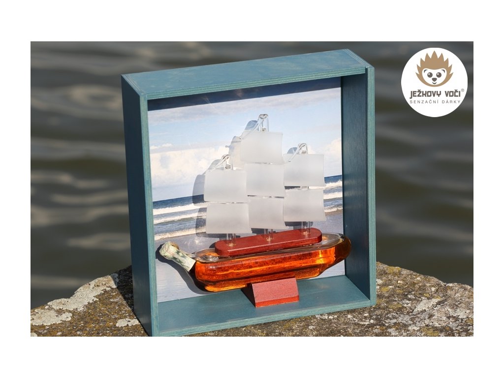 Tato skleněná láhev s nádhernou plachetnicí, vybavenou sedmi jemně vypracovanými skleněnými plachtami, vás přenese do světa klidného plachtění po nekonečně modrém oceánu. Každý detail této unikátní dekorace, od jemně zpracovaných plachet až po precizně provedený trup, odráží kouzlo námořních dálav a svobody. Láhev o objemu 0,2 l je naplněna 38% tuzemákem a je elegantně usazena na pevném dřevěném stojánku, který podtrhuje její umělecký vzhled. Tento jedinečný kousek je symbolem harmonie, dobrodružství a klidného snění pod širým nebem - dokonalý dárek nebo ozdoba, která zútulní váš domov a dodá mu nádech mořského kouzla.