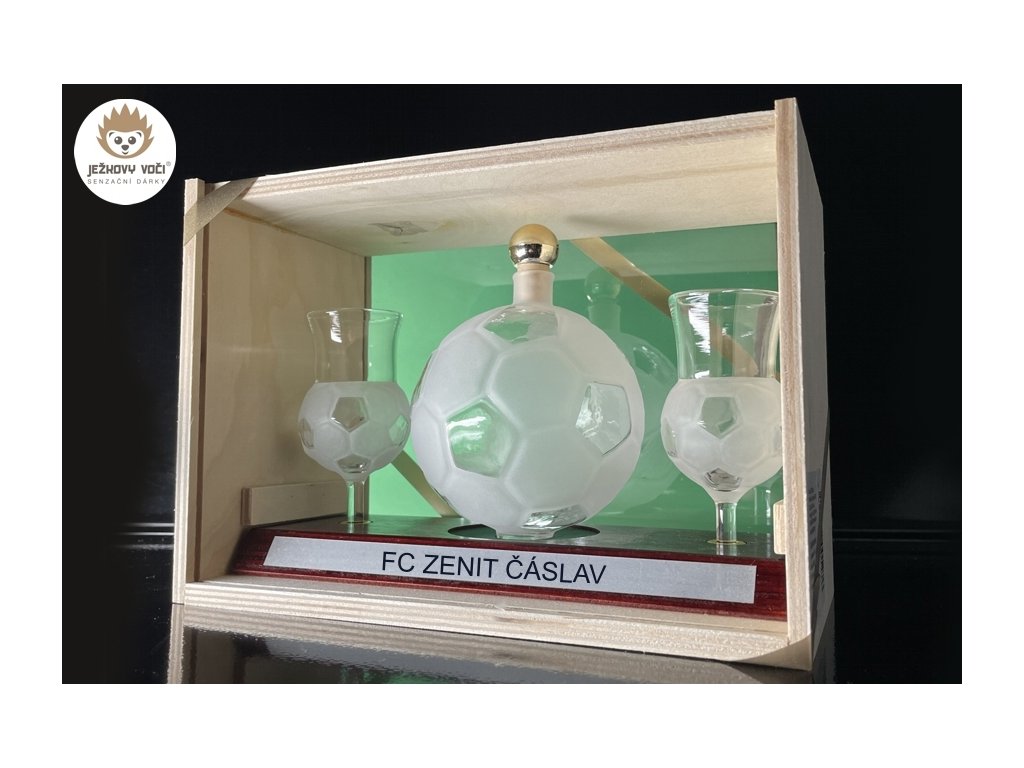 Exkluzivní sada pro pravé fanoušky FC ZENIT ČÁSLAV! Tato luxusní sada na alkohol obsahuje stylovou skleněnou láhev ve tvaru fotbalového míče o objemu 0,35 l a dva elegantní pohárky na stopce, ideální pro slavnostní přípitek při sledování zápasů. Vše je umístěno na precizně zpracovaném dřevěném stojánku s výrazným nápisem FC ZENIT ČÁSLAV, který podtrhuje jedinečný charakter tohoto setu. Skvělý dárek pro každého fanouška, který chce oslavit vítězství svého týmu stylově!