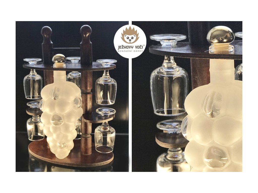 Tato ručně zpracovaná sada zaujme na první pohled - skleněný pískovaný hrozen jako symbol lahodného moku, šest čirých skleniček o objemu 0,1 l a precizně zpracovaný tmavěhnědý stojánek, který dodává celé sadě eleganci a stabilitu, Ideální dárek pro slavnostní chvíle, oslavy i stylové servírování domácí pálenky nebo likéru. Spojení řemesla, vkusu a tradice v jednom výjimečném setu.