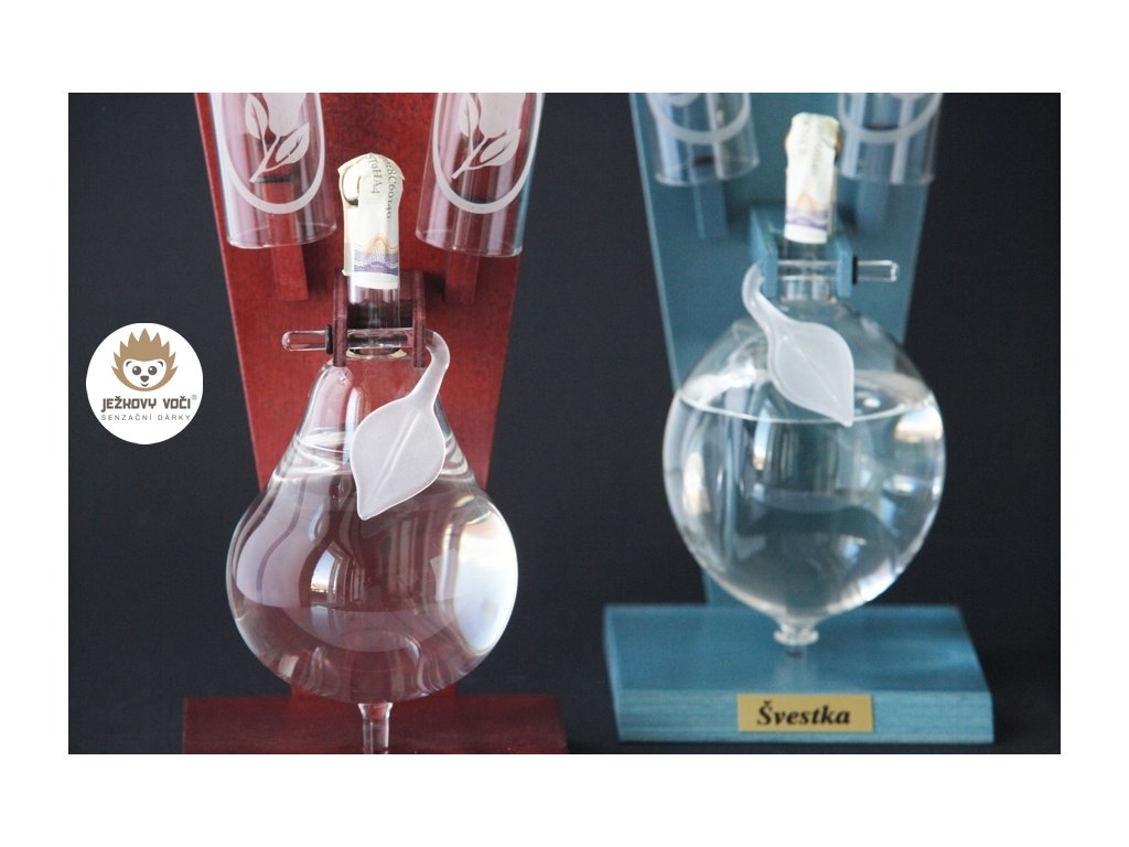Skleněná láhev ve tvaru hrušky naplněná 40% hruškovým destilátem zaujme nejen chutí, ale i originálním vzhledem. Dvě stylové odlivky a vínově mořený dřevěný stojánek tvoří harmonický celek, který potěší oko i chuťové pohárky. Ideální dárek pro milovníky hruškovice s citem pro detail a krásu.