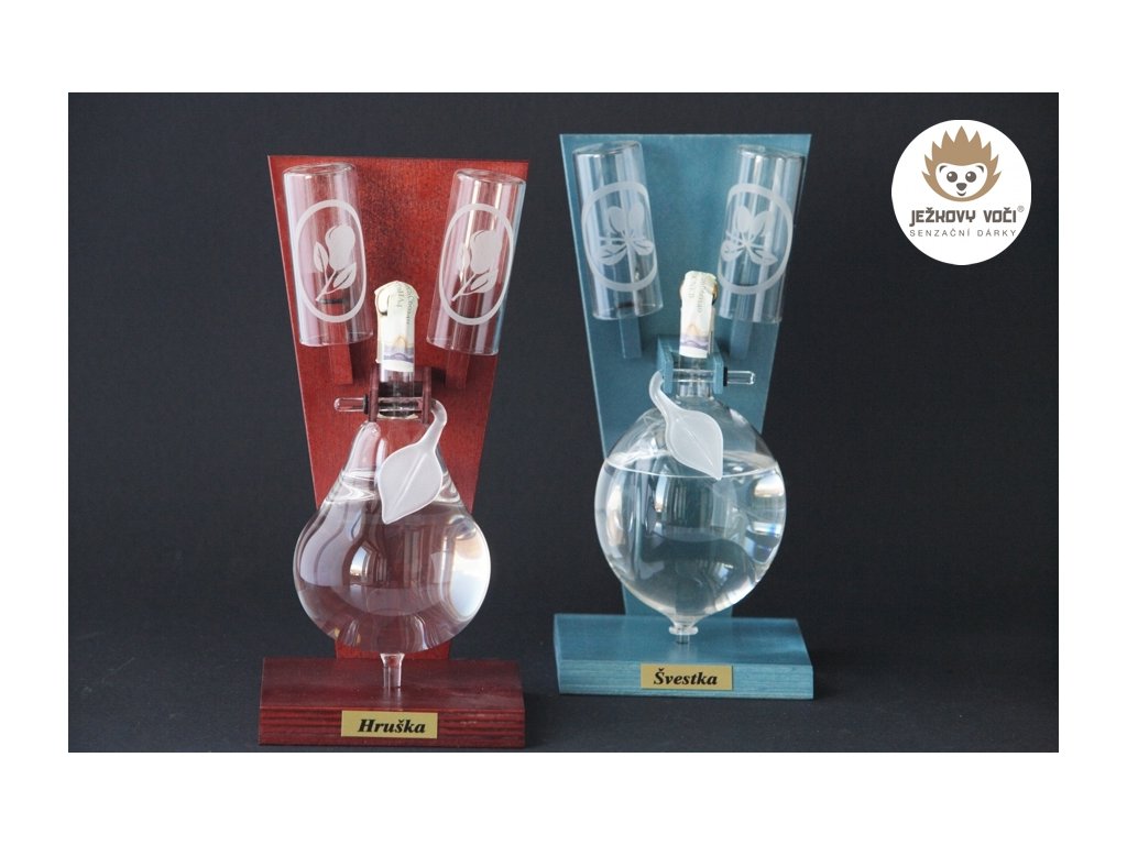 LUXUSNÍ DÁRKOVÁ SADA - HRUŠKA VE DŘEVĚNÉM STOJÁNKU A DVĚ ODLIVKY - S ALKOHOLEM 40% HRUŠKA