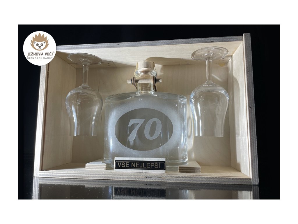 Oslavte krásné životní jubileum stylově s touto exkluzivní dárkovou. sadou. V ručně zpracované přírodní dřevěné bedýnce se ukrývá elegantní skleněná láhev s jemně pískovaným motivem čísla 70, doplněná o dvě skleničky pro přípitek na zdraví a radost ze života. Láhev je naplněna 40% švestkou, jejíž plná chuť potěší každého milovníka kvalitních destilátů.