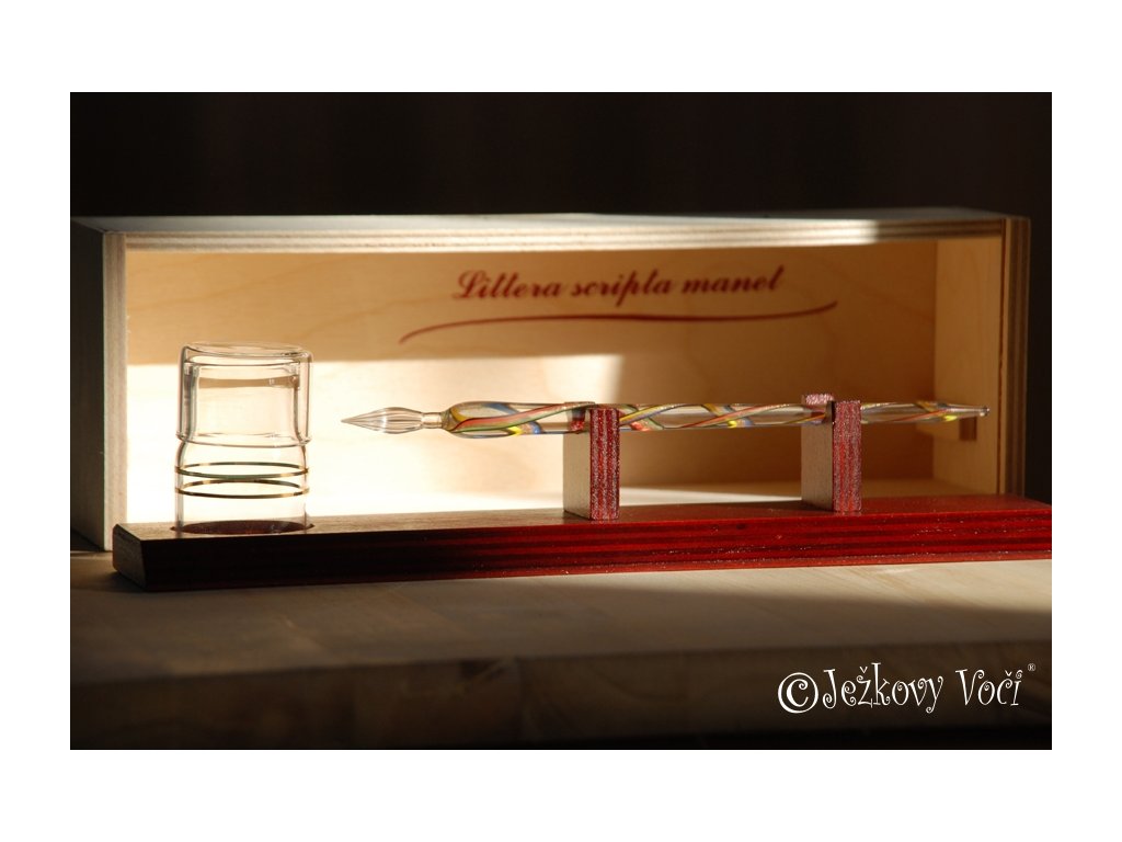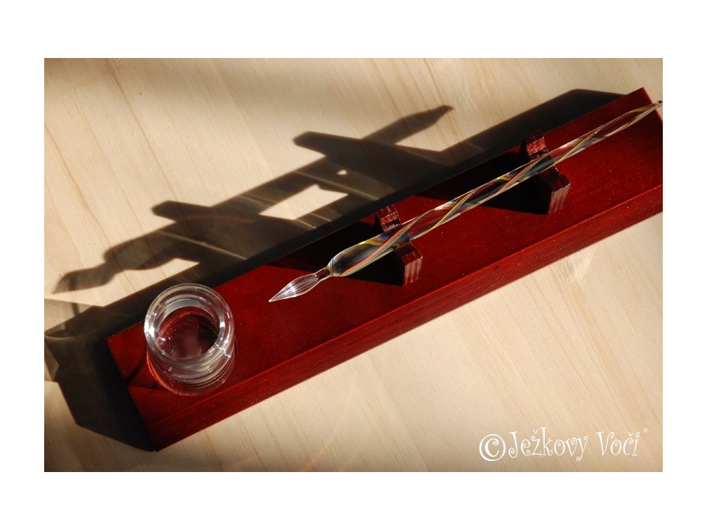 LUXUSNÍ SKLENĚNÉ PERO S INKOUSTOVÝM KALÍŠKEM VE DŘEVĚNÉ BEDÝNCE