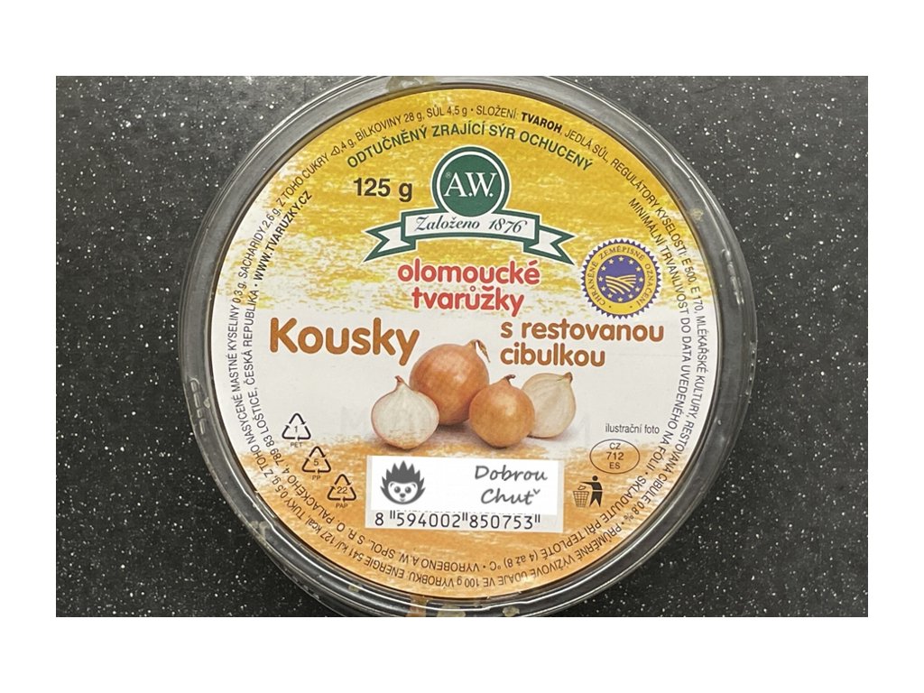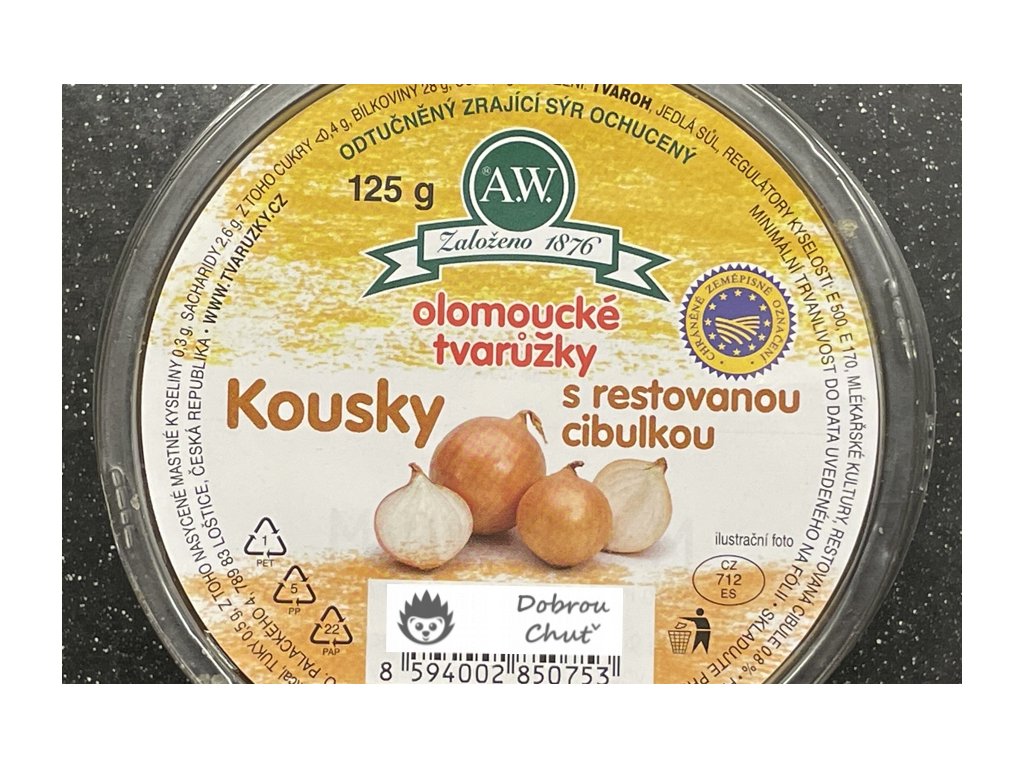 - TVAROH, jedlá sůl, regulátory kyselosti E500, E170, mlékařské kultury, restovaná cibule 0,8%