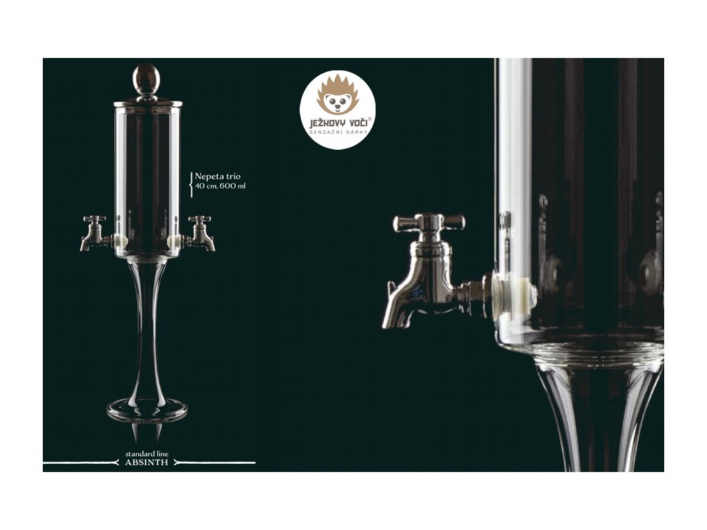 Tato ručně zpracovaná skleněná fontána se dvěma stylovými kohoutky umožňuje pomalé, ledově chladné odkapávání vody na cukrovou kostku položenou na absinthové lžičce - klasický způsob přípravy, který odhaluje jemné aroma a charakter nápoje.