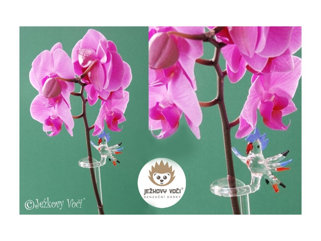 Jemná linie skla se vine jako stéblo, aby podepřela krásu orchideje a na jejím konci se zastavil drobný, barevný papoušek kakadu - posel veselí, věrného přátelství a hravé elegance. Ručně tvarované sklo v sobě nese křehkost přírody i mistrovství sklářské práce.