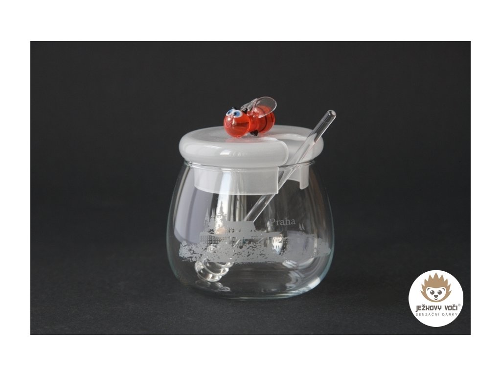 SUVENÝR - SKLENĚNÁ DÓZA NA MED S VČELOU - PRAHA HRADČANY