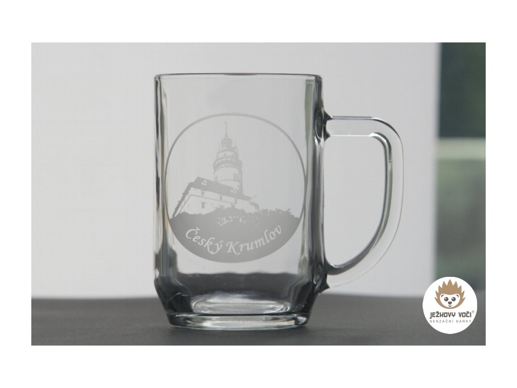 Rozměry: Výška 140 mm Průměr 90 mm Objem 0,5 l Pískovaný motiv Českého Krumlova se může měnit